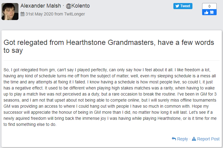 希望我的继任者会比我更珍惜在GM的荣誉,不管它会持续多久。也让我们看看新获得的自由是否会让我重新在《炉石传说》中获得的巨大快乐,又或者是我该找点别的事情做了。