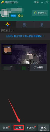 第一步,打开腾讯游戏平台软件进入主页,点击页面底部的“工具”。