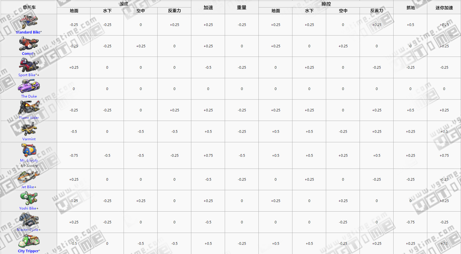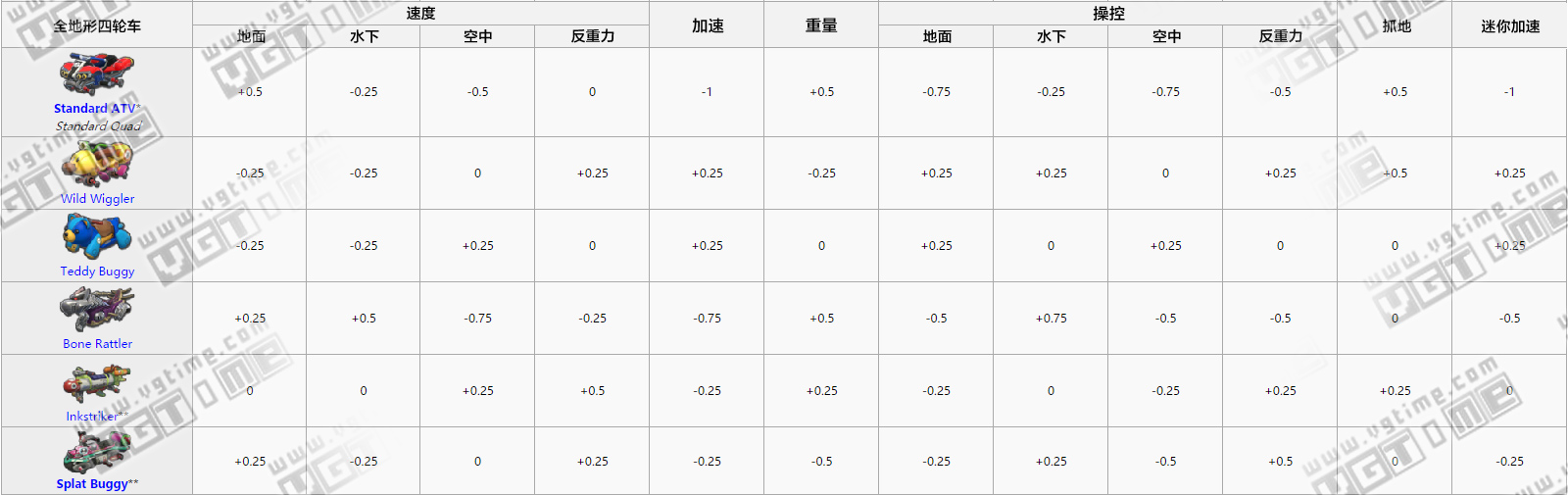 游戏中共有三类车辆,分别是卡丁车、摩托车和全地形四轮车,这三类车辆的属性总表如下: