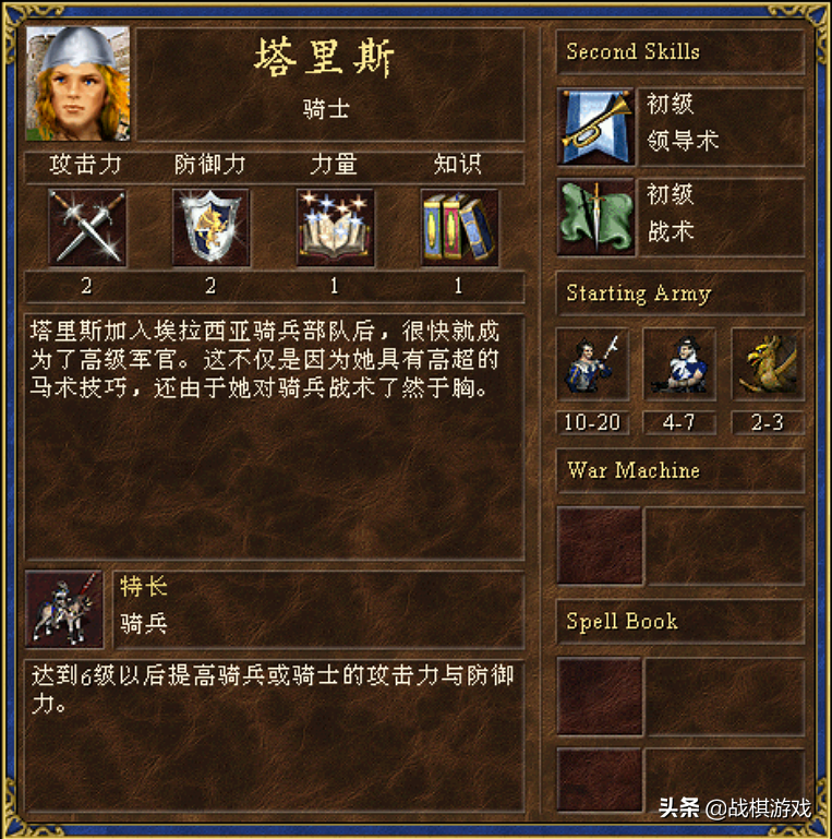 才艺:★★★★★ 位居三大钢板,防御术降低战损,技能树完美,看见就招募的典型英雄