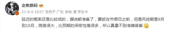 8月6日,据数码博主@定焦数码 爆料,华为Mate60系列发布会延迟的概率比较低,据说都已经在准备了,要赶在节假日之前,但是风控期是9月到10月,跨度很大,比预期的保密性高很多,所以真拿不到准确答案。
